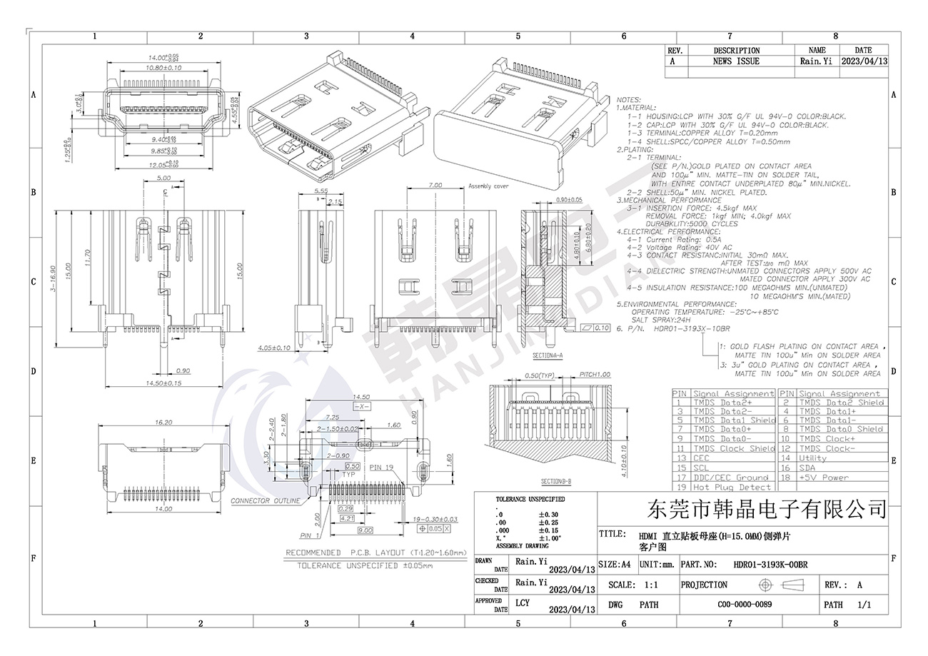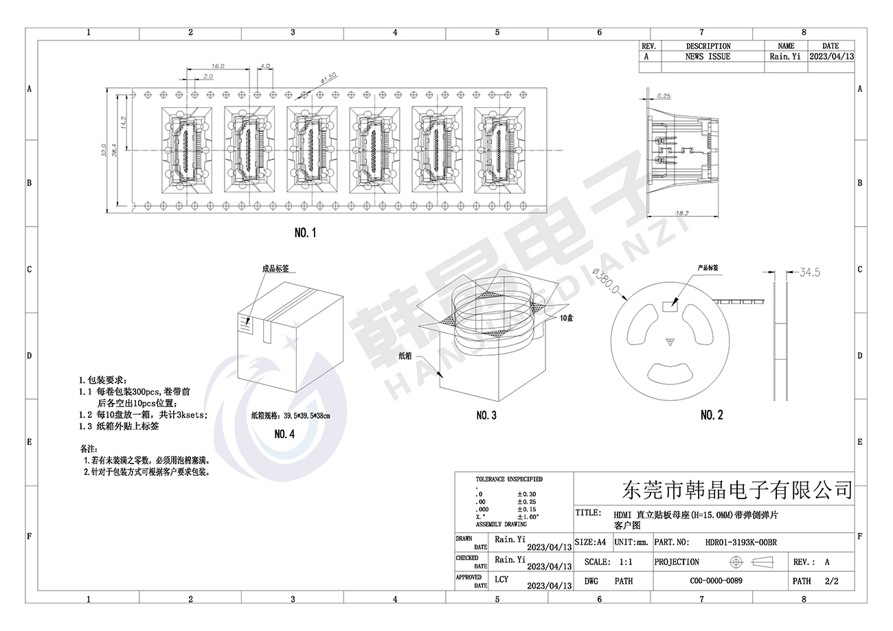 • HDMI立貼精密連接器 15.0H側(cè)凸包 型號(hào):HDR01-3193K-10BR