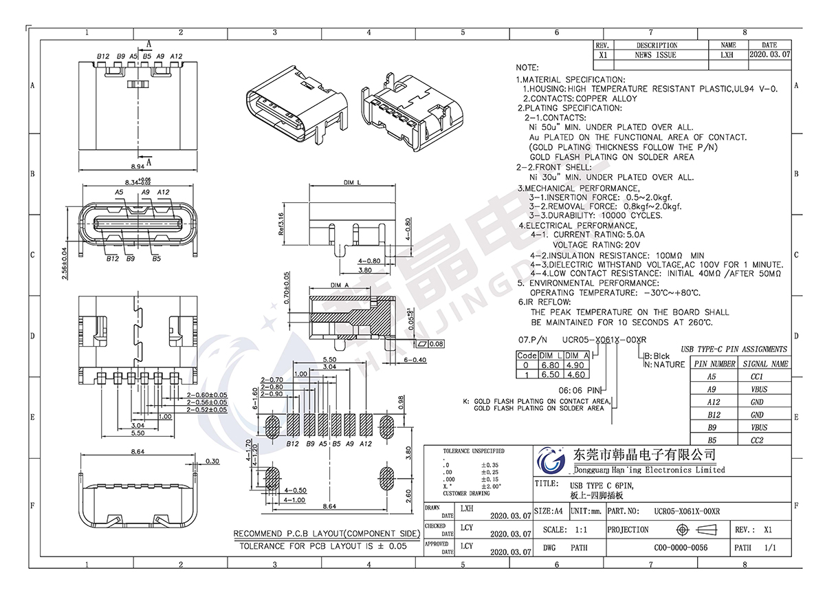 • TYPE-C 6PIN板上型 L-6.5mm四腳插板 型號:UCR05-X061-00XR-6.5