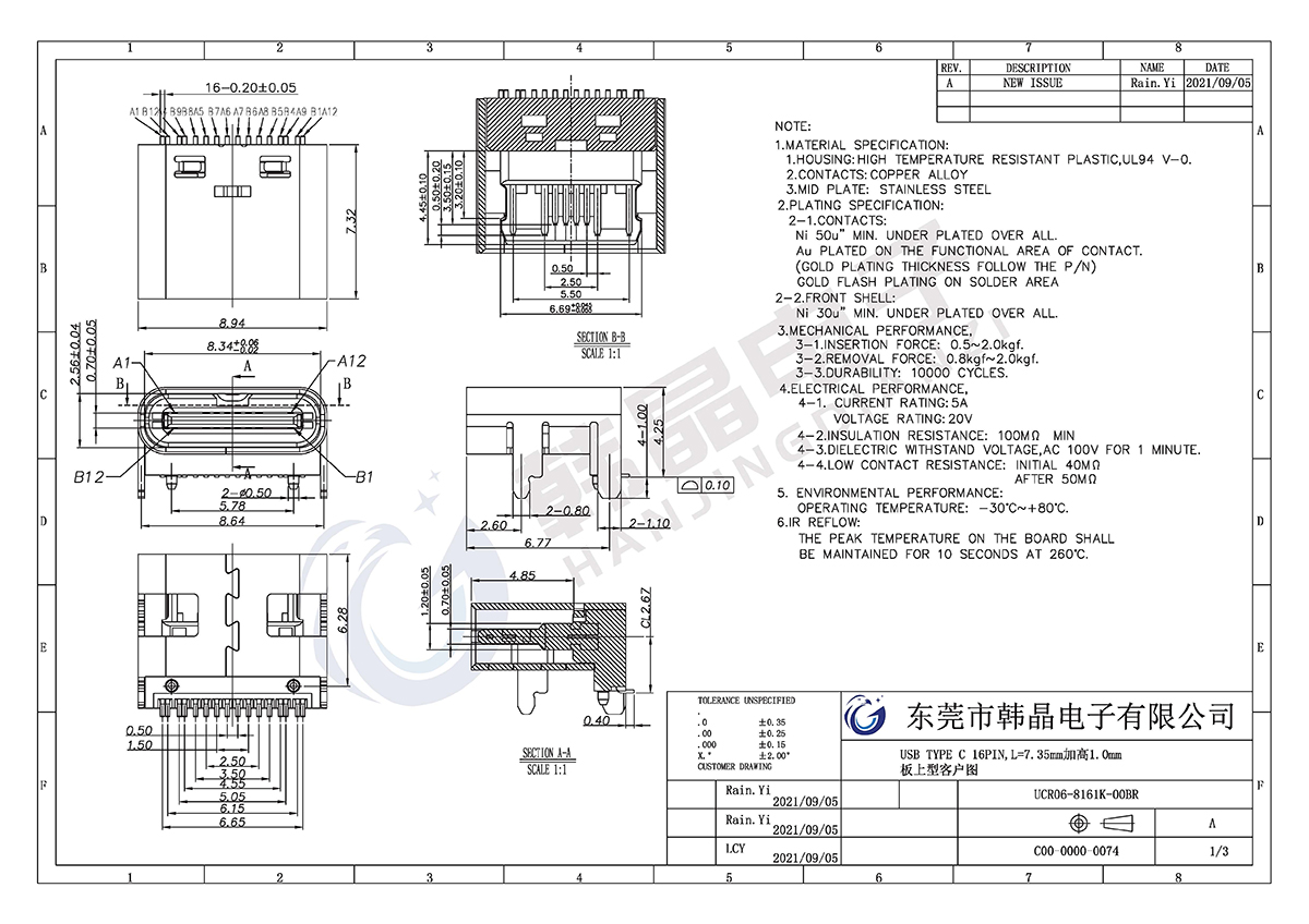 • TYPE-C 16pin L-7.35mm板上墊高型母座1.0mm 型號:UCR06-8161K-00BR