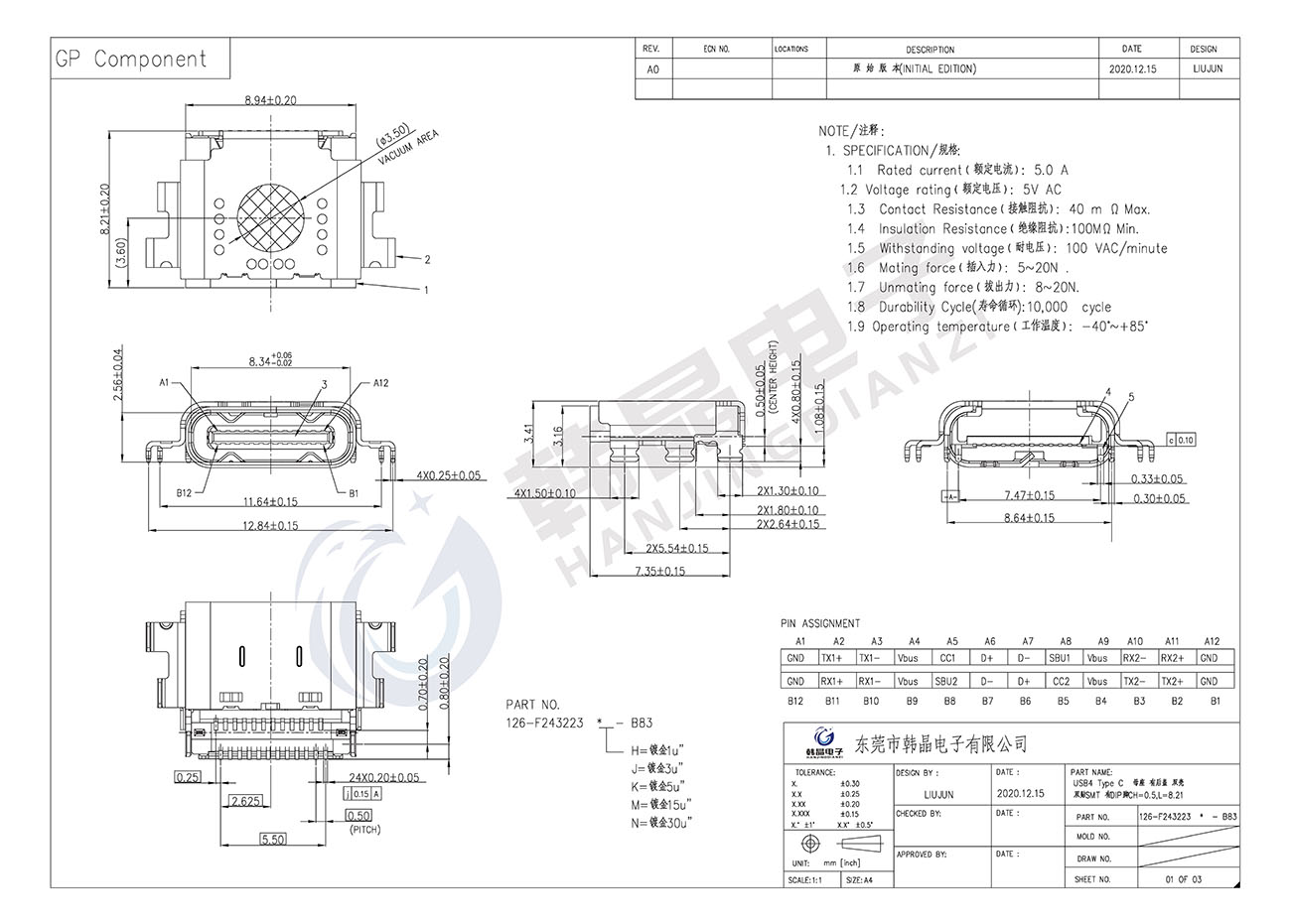 • B83USB4 Type C 母座 有后蓋 雙殼 雙貼SMT有DIP腳 CH=0.5,L=8.21 型號(hào):126-F243223X-B83