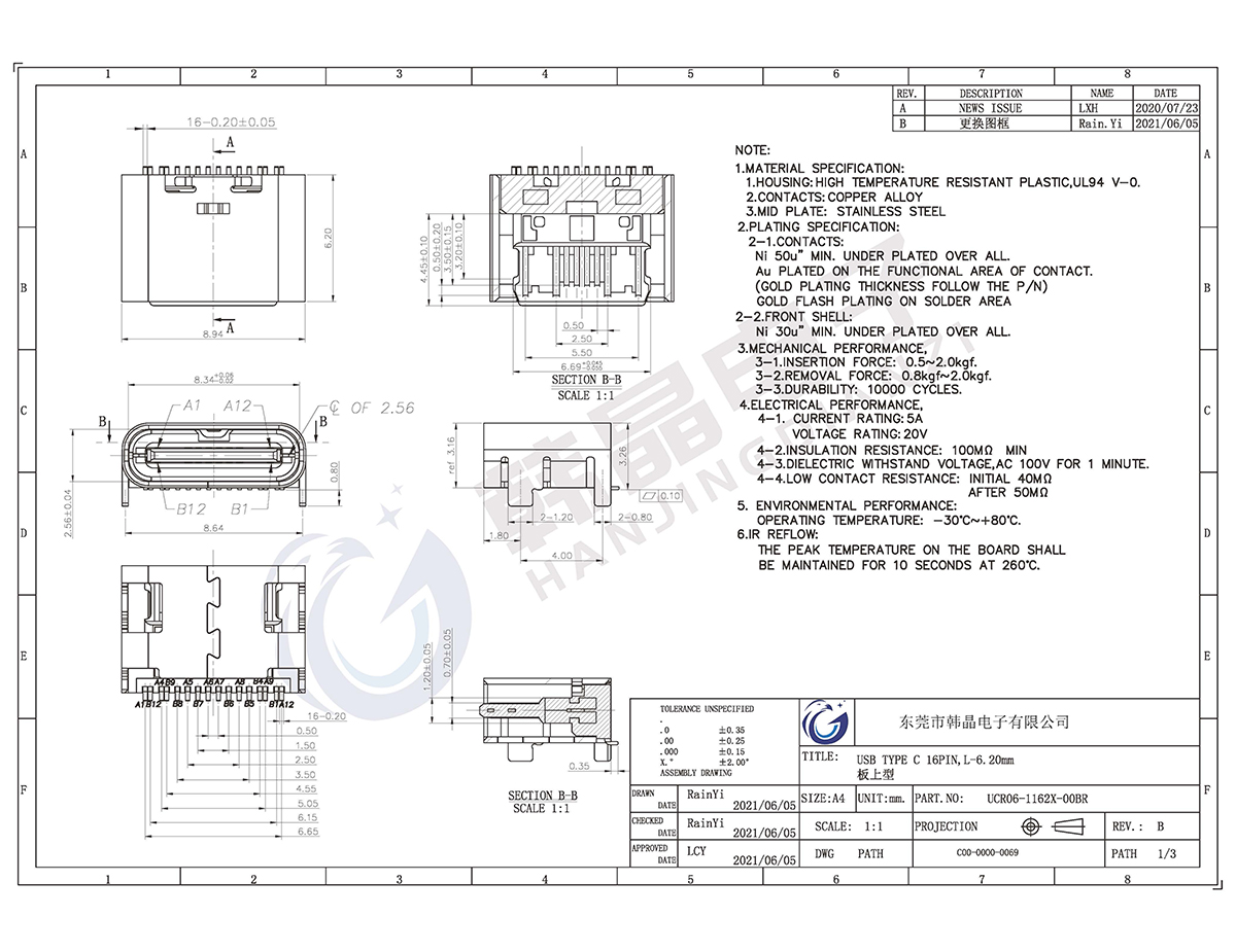 絕緣體材料: LCP,UL94V-0;COL0R;BLACK