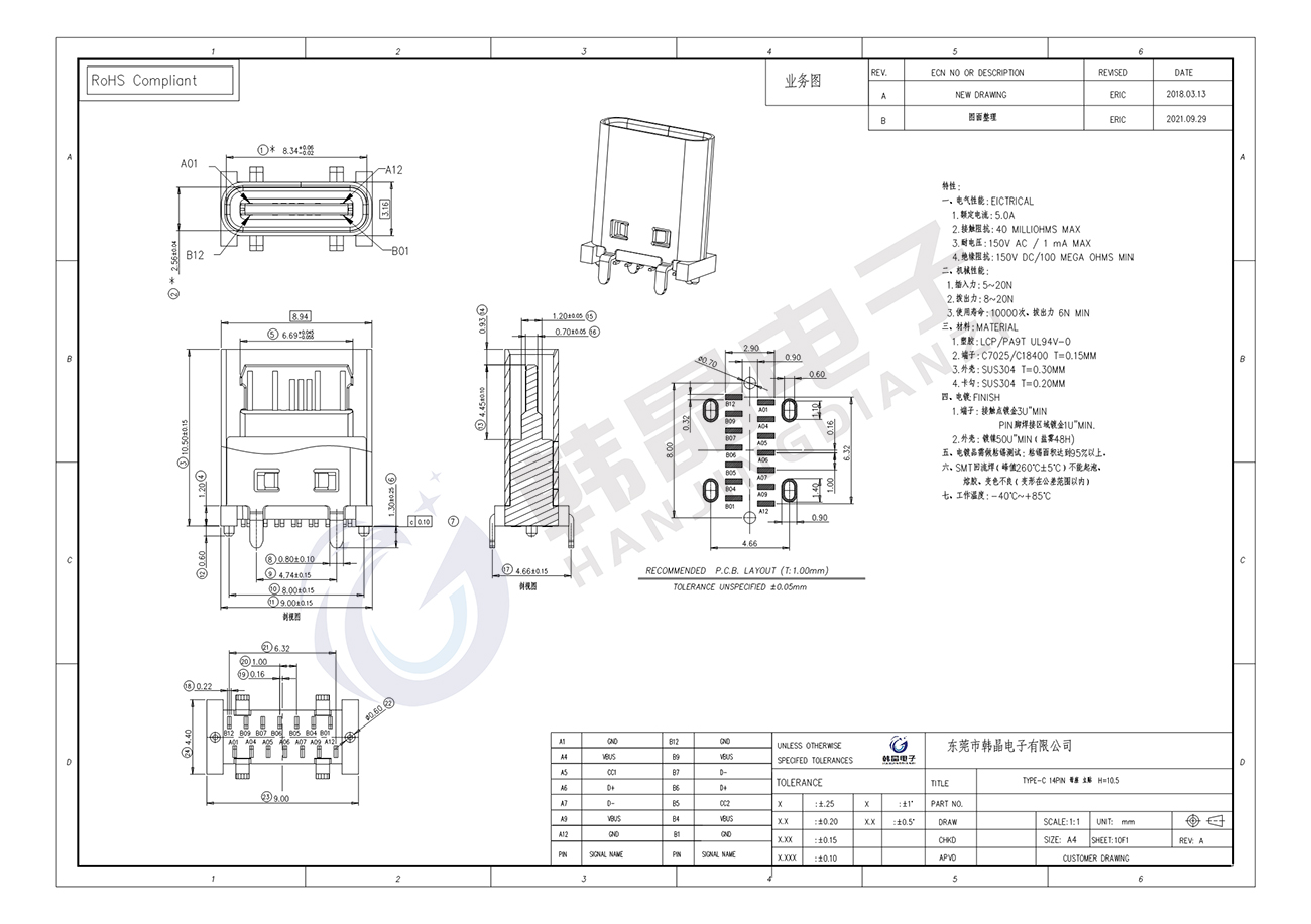 絕緣體材料: LCP, PA9T UL94 v-0