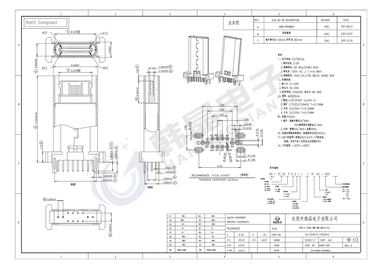 絕緣體材料: LCP, PA9T UL94 v-0